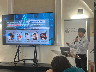 Mr. Kanaji presented his work titled “An Empirical Study of Security-Policy Related Issues in Open Source Projects.” This study focuses on SECURITY.md, a file used to report vulnerabilities in GitHub repositories, and investigates the reasons behind its low adoption rate. Specifically, the study analyzed Issues related to SECURITY.md and five other community health files to identify the factors that hinder its adoption. The results revealed that, in some cases, the introduction of SECURITY.md can instead cause confusion among contributors.