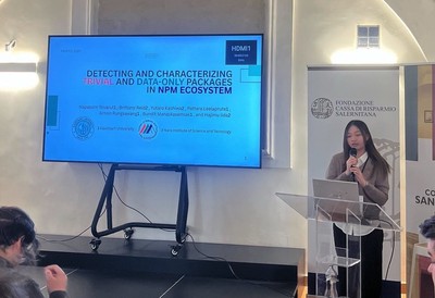 Ms. Tonnam presented a work titled “Detecting and Characterizing Low and No Functionality Packages in the NPM Ecosystem.” The study examines trivial packages, which offer minimal functionality, and data-only packages, which contain no executable logic. A rule-based static analysis method was developed to detect these packages and to assess their prevalence and associated security risks in the 2025 npm ecosystem. The analysis showed that 17.92% of packages were trivial, with vulnerability levels similar to non-trivial ones, and that data-only packages, though less common, also pose risks. The proposed detection tool achieved 94% accuracy (macro-F1 0.87), demonstrating its usefulness for large-scale analysis and reducing security exposure.