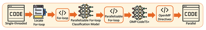To replicate the functionality of automatic parallelization tools, we developed two models: the Parallelizable For-loop Classification Model [1,3], which detects whether a given for-loop is parallelizable, and the OpenMP Directive Generation Model [2], also referred to as OMP-CodeT5+, which generates OpenMP directives for parallelizable for-loops identified by the classification model.