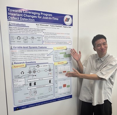 また,本研究室の堀川君,白井君,金地君,渡邊君はICSE2025勉強会及び学生国際英語ポスターセッションに参加しました. ICSE2025勉強会は,ソフトウェア工学分野において最も権威がある国際学会ICSE(International Conference on Software Engineering)で採録された論文を紹介し,最新の研究動向を学ぶワークショップになっています.そこで,学生たちが実施している研究分野と関連している5本の論文について発表を行いました. 学生国際英語ポスターセッションにおいて,堀川君は"Understanding Refactoring in Test Code: An Empirical Study"というタイトルで発表しました.本研究はテストコード固有のリファクタリングの体系化と影響調査を実施しています.分析結果から,37種類のテスト固有リファクタリングを発見し,テストスメルに対して一定の効果を持つことが明らかとなりました.